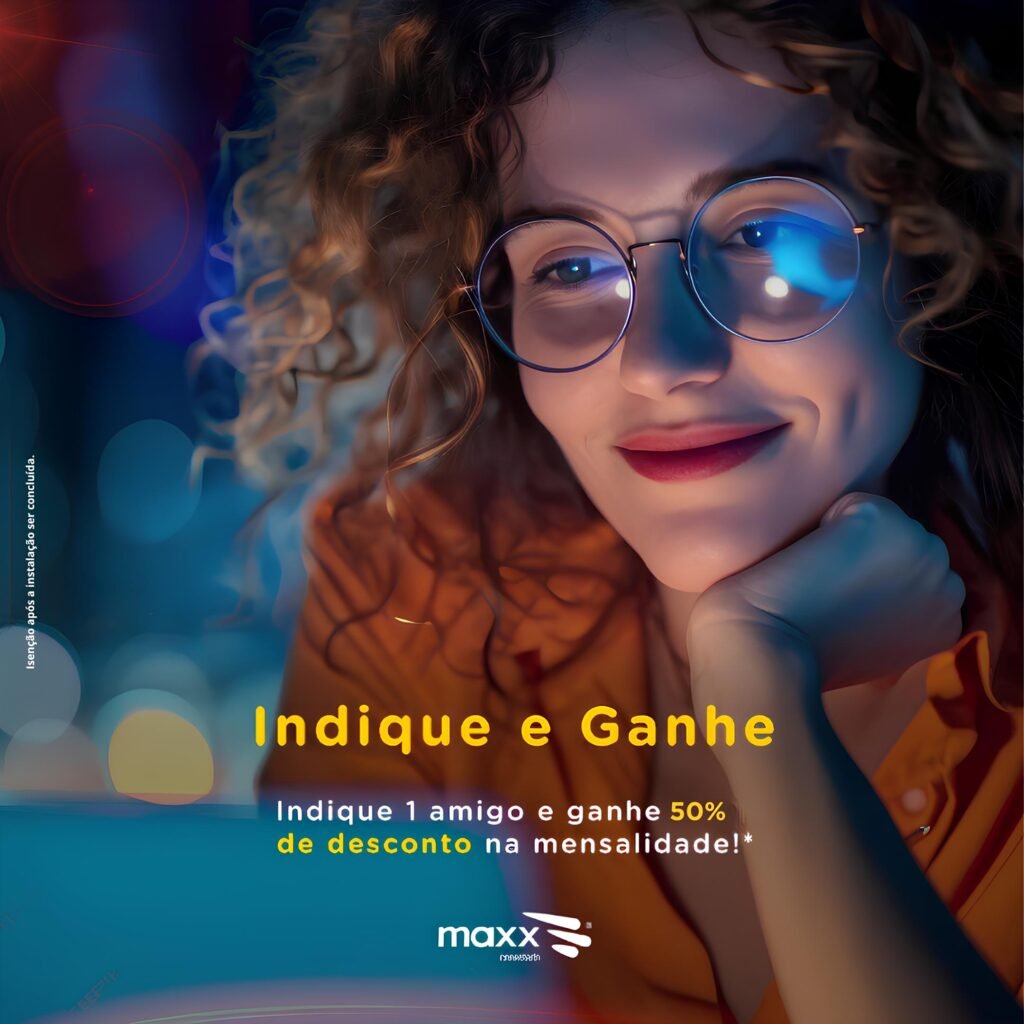 Sua indicação vale muito! Ao trazer um novo cliente, agora você ganha 50% de desconto na sua próxima mensalidade. Ele instalou e você GANHOU. Ajude um amigo a ficar conectado com a Maxx e ganhe junto com ele! 🚀